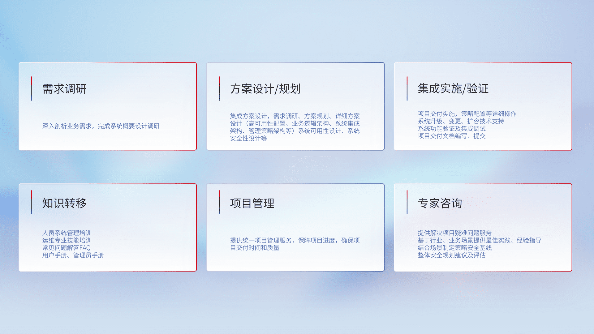 针对客户行业特性,,将宏观的安全战略和需求,,,通过专业的交付服务,,,实现项目落地,,,,为客户提供标准规范的集成交付服务。。